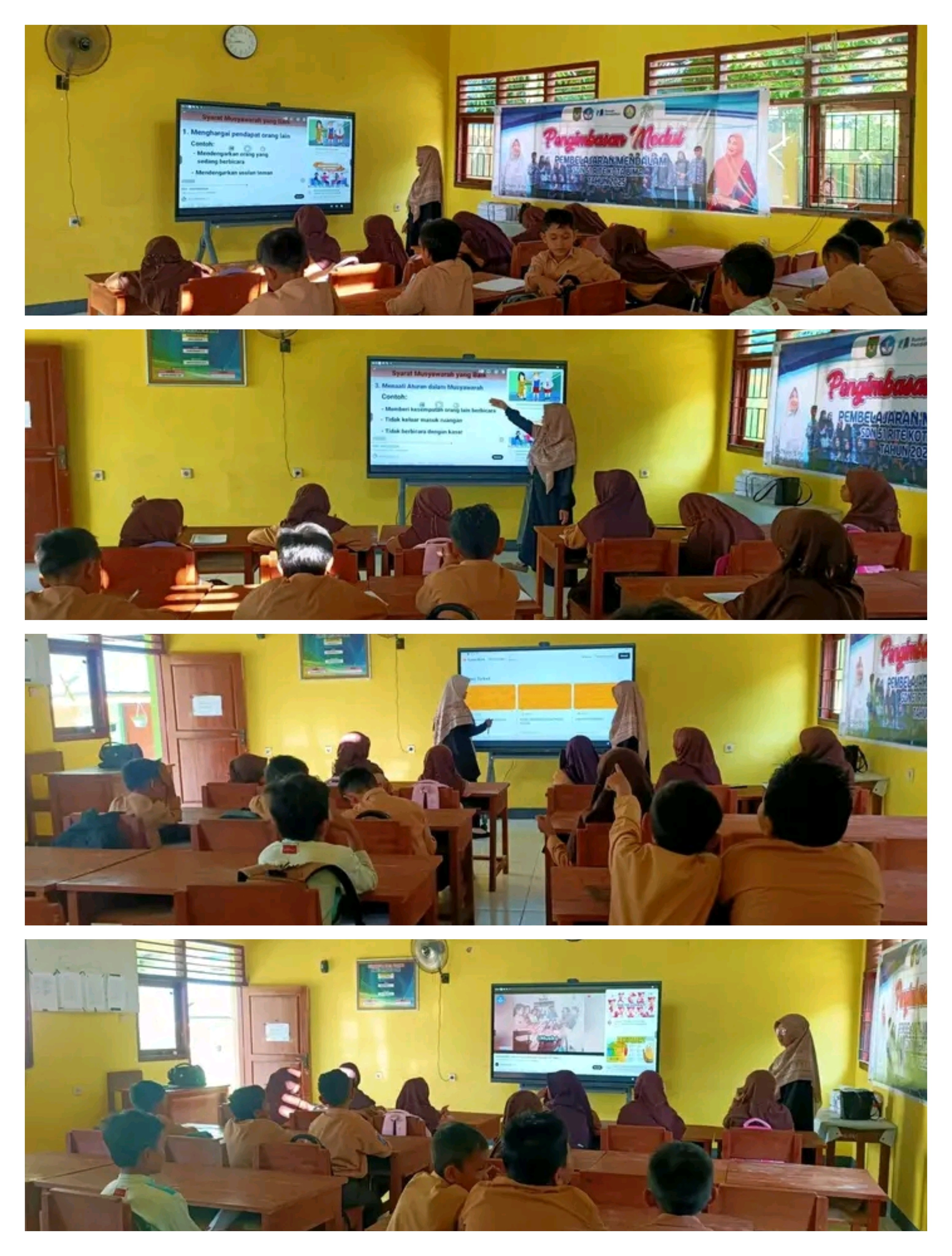 Selama kegiatan berlangsung, siswa tampak antusias mengikuti pembelajaran yang dipandu oleh guru kelas. Dengan menggunakan IFP, siswa dapat berpartisipasi aktif dalam berbagai aktivitas seperti menonton video edukatif, menjawab kuis interaktif, dan berdiskusi mengenai penerapan nilai-nilai Pancasila dalam kehidupan sehari-hari.